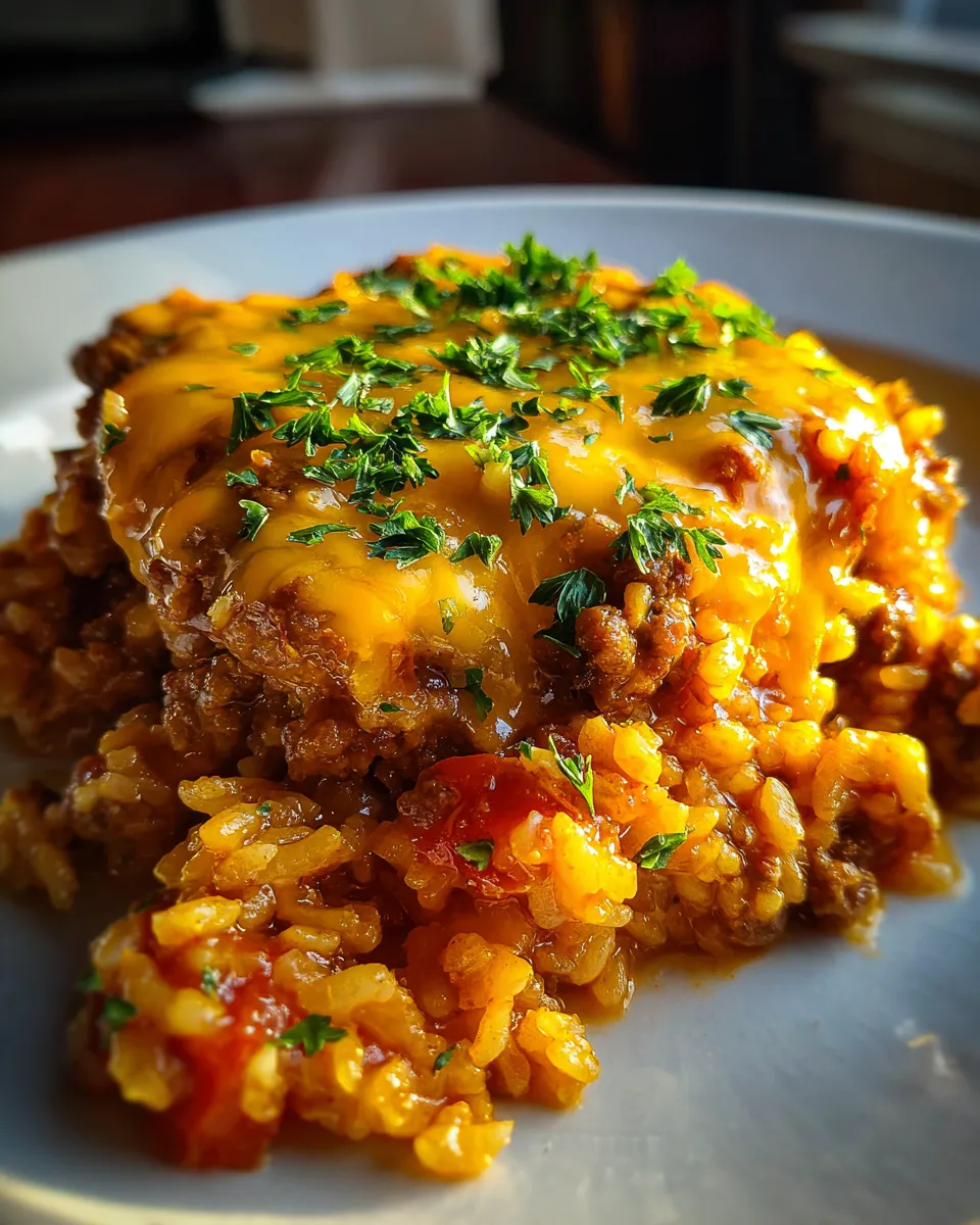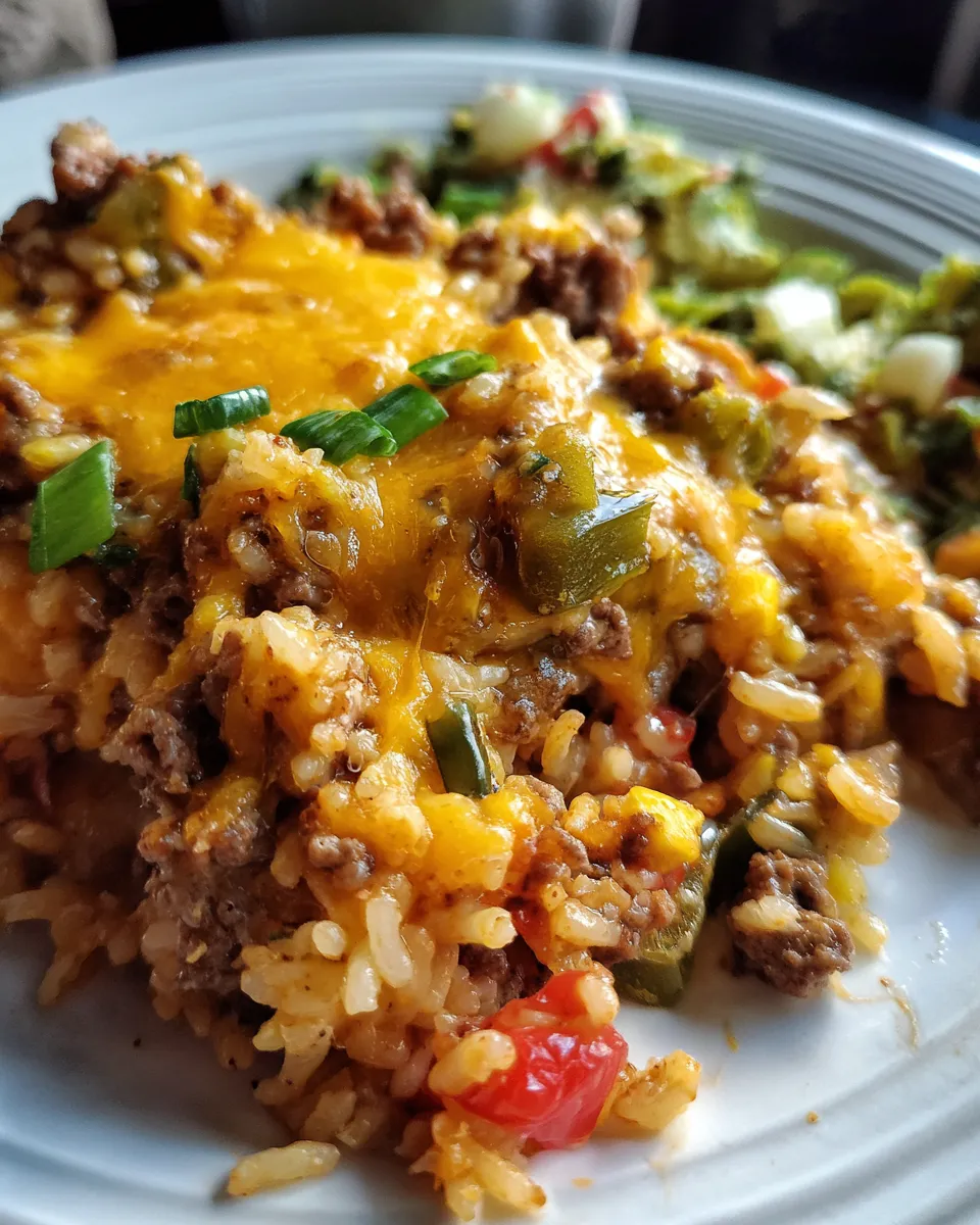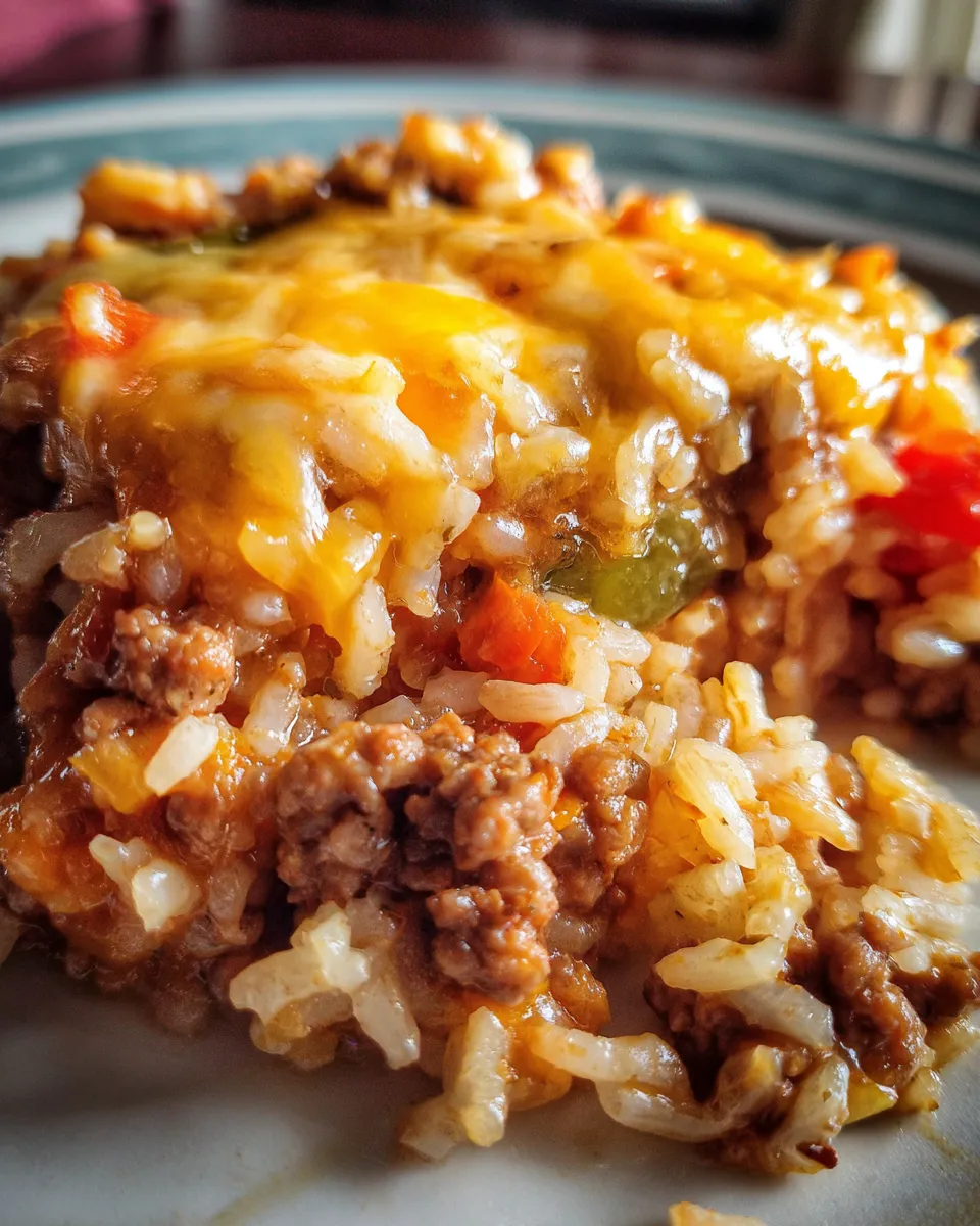A simple, filling, and flavorful cheesy ground beef rice casserole that combines juicy ground beef, fluffy rice, and a blend of cheddar and mozzarella cheeses into a warm, comforting dish perfect for family dinners.