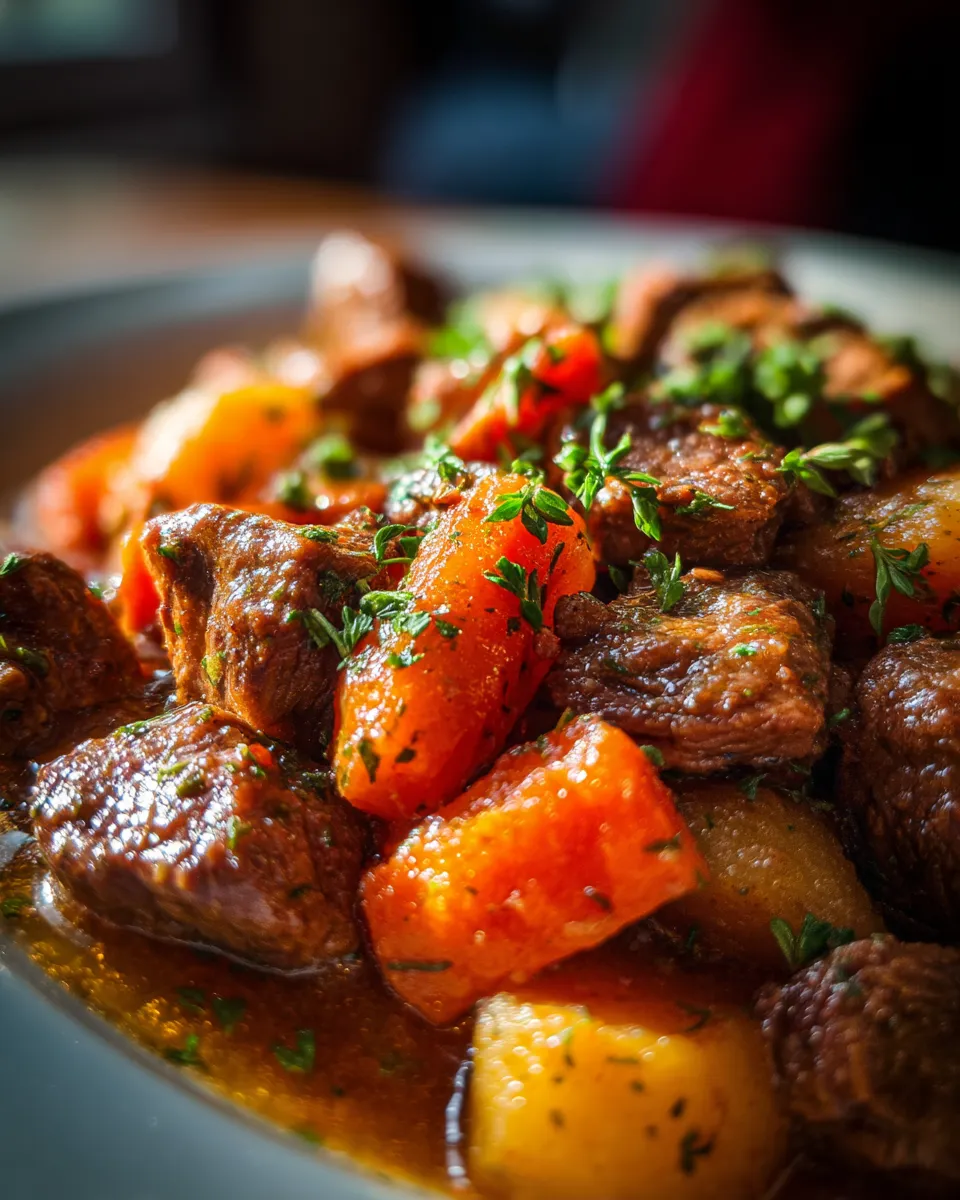This Classic Homemade Beef Stew recipe features slow-cooked tender beef chuck with a velvety, flavorful broth, loaded with carrots, celery, and potatoes for a soul-warming and hearty meal perfect for cozy dinners.