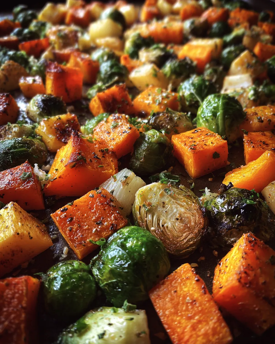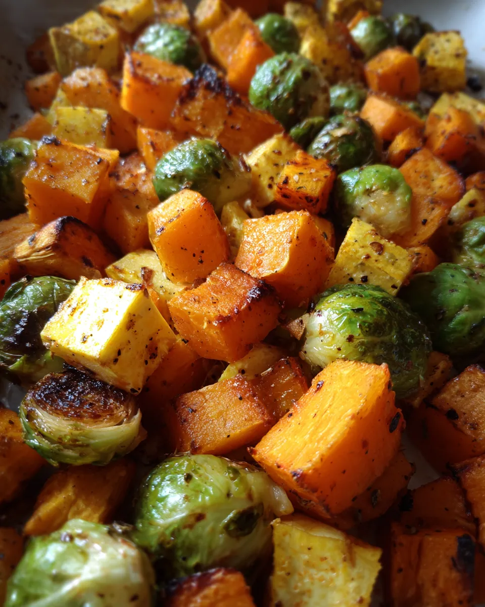 A simple and satisfying roasted vegetable side dish featuring butternut squash, Brussels sprouts, and sweet potatoes seasoned with olive oil, garlic powder, thyme or rosemary, salt, and pepper. Perfect for quick, healthy, and flavorful meals.